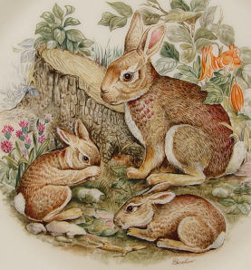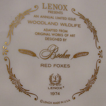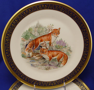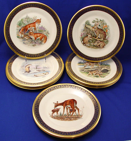 SET OF 10 LENOX COLLECTOR PLATES, WOODLAND WILDLIFE: Adapted from original works by artist Edward Marshall Boehm. Each plate is an Annual Limited Issue and made in the USA of fine porcelain by Lenox, with one of several Boehm Wildlife prints in full, vibrant color and exceptional detail. The centered prints are surrounded by richly detailed gold filigree over blue and gold rims. On the reverse you'll find the Lenox seal with the title and year of the design, also etched in gold, and gold-rimmed base. Included in this set are: 1973 Raccoons, 1974 Red Foxes, 1975 Rabbits, 1976 Eastern Chipmunks, 1977 Beavers, 1978 Whitetail Deer, 1979 Squirrels, 1980 Bobcats, 1981 Martins, 1982 River Otters. Sold as a lot.