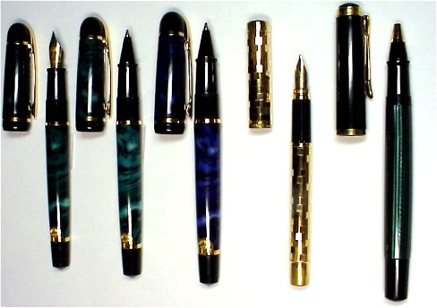 LOT OF EUROPEAN PENS: To include, WATERMAN of Paris France - Phileas Green Marble Fountain and Ball Point, Phileas Blue Marble Ball Point, and a gold toned paneled pen marked WAT 5.1. And a Pelikan of West Germany ball point in classic green and black motif.