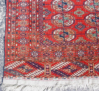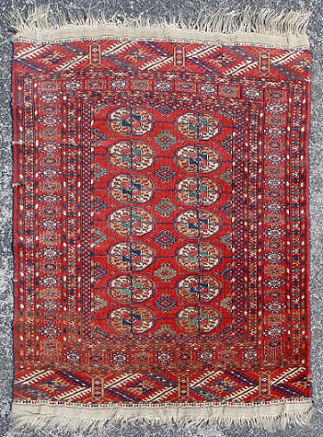 SEMI ANTIQUE HAND TIED TURKOMAN ORIENTAL RUG: Approx. 3'1'' x 3'8'', all wool, Tekke Bokhara design, semi-depressed warp threads, approx. 140 knots per square inch. Ca. early 20th Century. Worn condition.