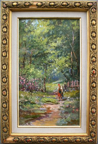 FIGURE ON A PATH, O/C, INDISCERNIBLY SIGNED LL: 16'' x 9 1/2'', gold frame with wear and missing gesso, 1/2'', 21'' x 14''.