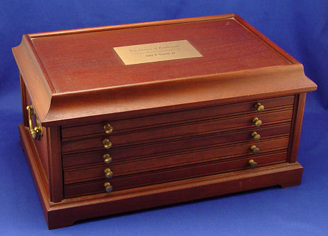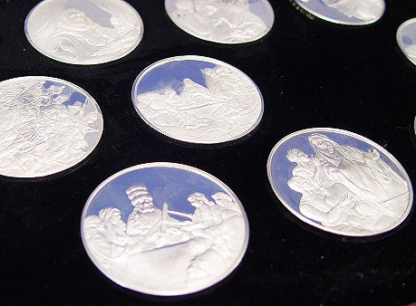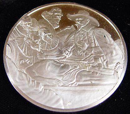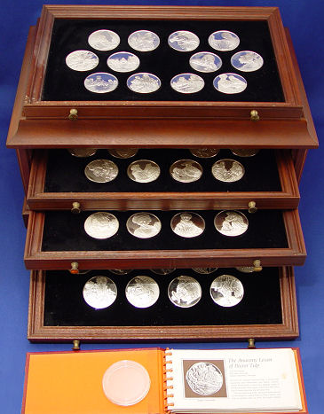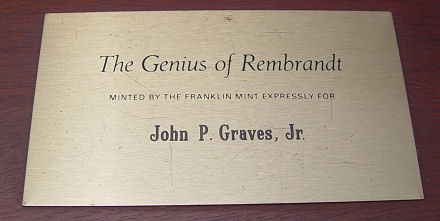 FRANKLIN MINT COLLECTION OF ''THE GENIUS OF REMBRANDT'', 50 STERLING COINS IN MAHOGANY BOX: Each medal weighs 2.12 troy oz. and has a different scene and title verso. In original display tray box, name plate to top stating ''Minted by the Franklin Mint expressly for John P. Graves Jr.''