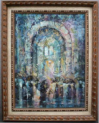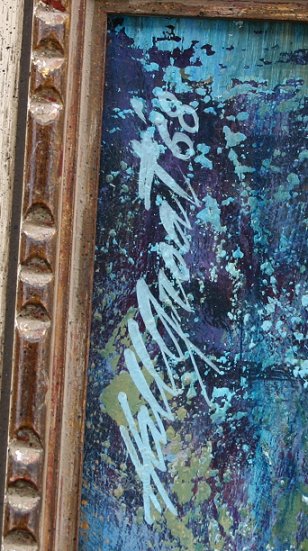 GROAT, Hall (American, 1933-): ''Night Rains'', O/M, 24'' x 18'', signed UL, dated '68, gesso frame, 29 1/2'' x 23 1/2'', exhibited at the Tyringham Gallery. The United Nations awarded Groat with the honor of having a series of paintings for their stamp reproductions, 7 first issues will be sold with the painting as well as a letter of authenticity from the artist, and evaluation for $2,200.