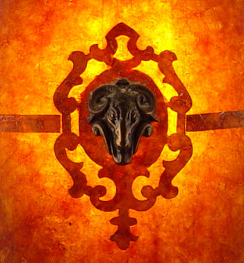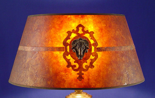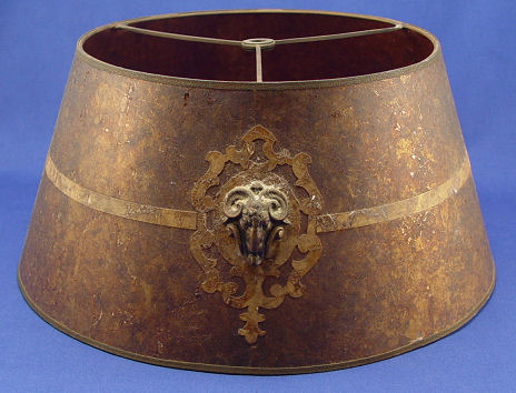 VINTAGE MICA LAMP SHADE: Rams head masquerons mounted on sides. 7''h. 10'' dia. at the upper rim.