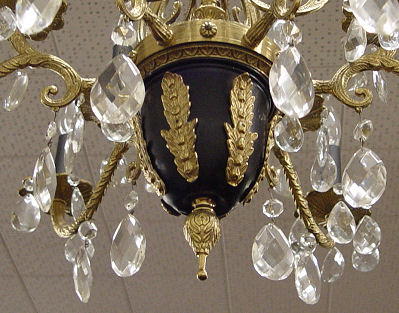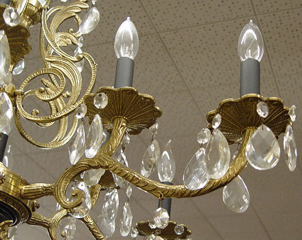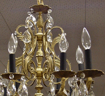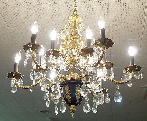 CONTEMPORARY BRASS AND BLACK CHANDELIER: 12 light chandelier, brass with crystal prisms.