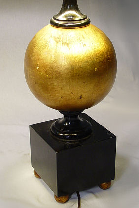 PAIR OF CONTEMPORARY BLACK AND GOLD TABLE LAMPS: Wood lamps with gold lined black shades. 36''h.