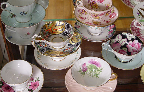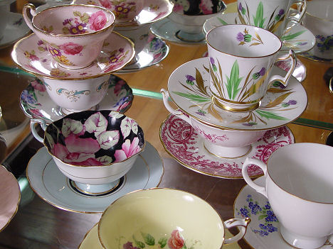 LARGE COLLECTION OF BONE CHINA CUPS AND SAUCERS: Twenty one sets, mostly English. Makers to include, Shelley, Coalport, Paragon, Tuscan, Royal Albert, etc.