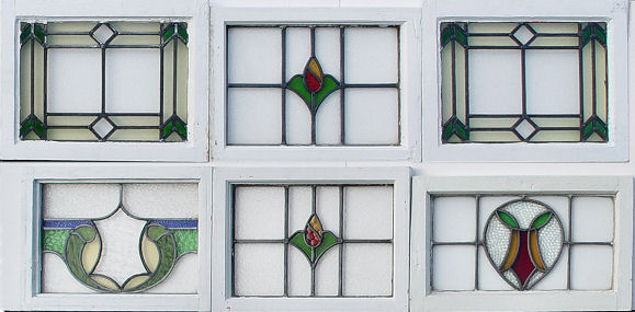 6 ENGLISH STAINED GLASS WINDOWS: Newly painted and puttied frames. Five are 21'' x 16'', one is 24'' x15''.