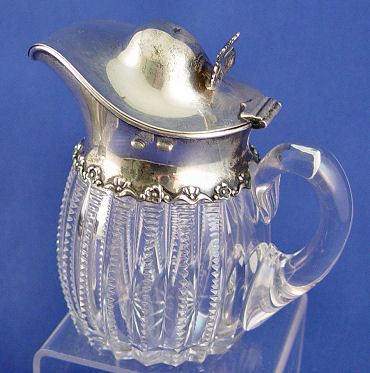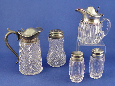 ESTATE GROUP OF STERLING AND CUT GLASS: Sterling mounted cut glass syrup pitcher, a cut glass silverplate mounted syrup, cut glass muffineer, and a pair of cut glass shakers. The sterling piece is marked sterling, the plated pieces have had the silver polished right off.