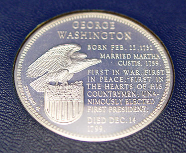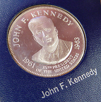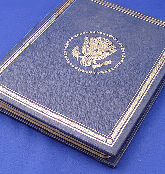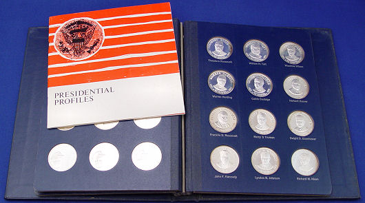 FRANKLIN MINT TREASURY OF PRESIDENTIAL COMMEMORATIVE MEDALS AMERICAN EXPRESS EDITION: 36 sterling coins in portfolio. Each medal weighs 2.12 troy oz. and has a different US President and info verso. Sealed in original display book of blue with gold gilt decoration and title. Overall weight 4.5 lbs.