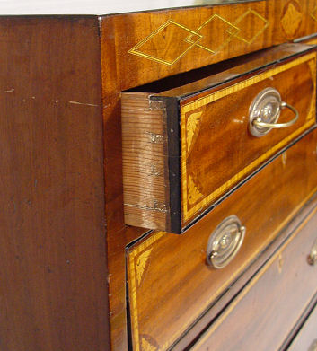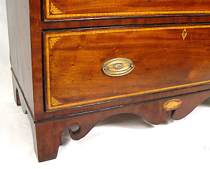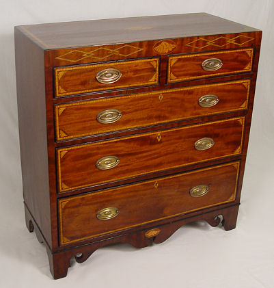 19TH C PARQUETRY AND SHELL INLAY CHEST OF DRAWERS: 2 half length over 3 full length drawers, block feet, shaped skirt, 42'' h. x 40'' w. x 18 1/2''.