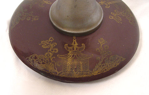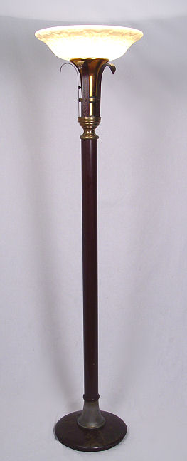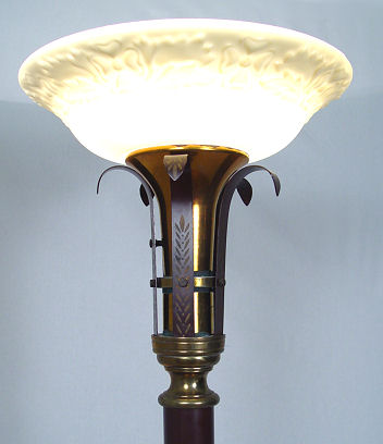 TORCHIERE LAMP: Japanned design on metal base, embossed opaque glass shade. 67 1/2''h.