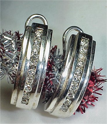 1CTW DIAMOND EARRINGS: 14k white gold partial hoop earrings with pierced findings and omega backs. Each with 10 small diamonds channel set to front, approx. 7/8'', 11.7 grams.
