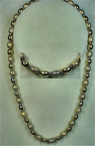 TEXTURED GOLD BEAD NECKLACE: Oval beads of alternating polished and textured 14k yellow gold, approx. 17''l., 22 grams.