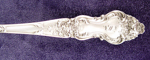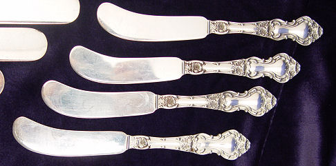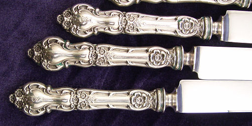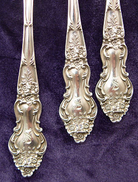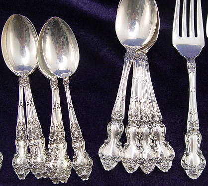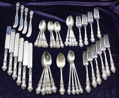 ''MEADOW ROSE'' STERLING FLATWARE BY WALLACE SILVERSMITHS: 46 pieces to include 6 dinner knives (8 3/4''l), 6 dinner forks (7 1/8''), 4 salad forks, 12 teaspoons (5''), 4 teaspoons (6''), 6 tablespoons, 4 iced tea spoons, and 4 butter knives. Monogrammed ''S'', the larger teaspoons, butters, and salad forks do not have monograms.