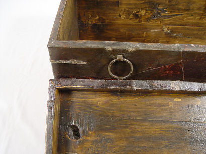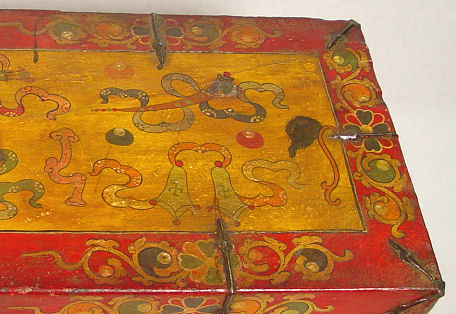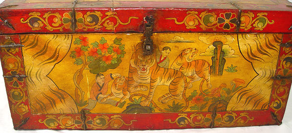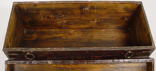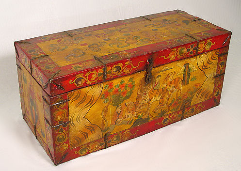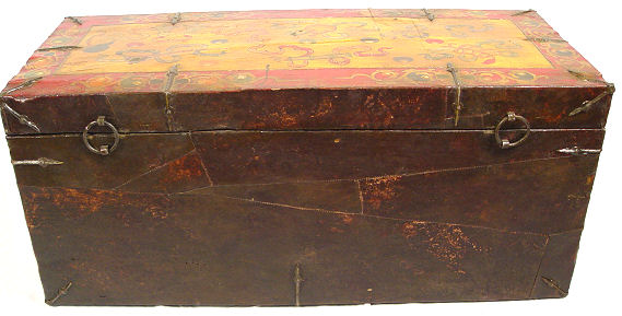 19TH C CHINESE PAINT DECORATED LEATHER COVERED BOX: Leather over wood, iron rings act as hinges. 17'' x 37 1/4'' x 16''.