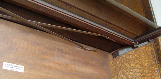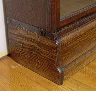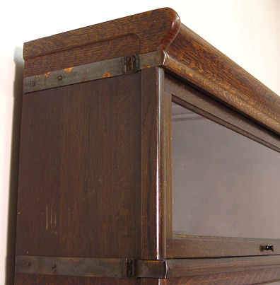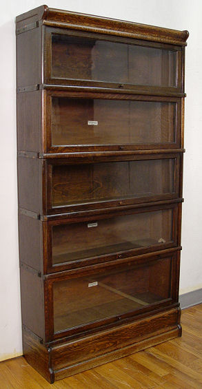 TIGER OAK GLOBE WERNICKE FIVE STACK BARRISTER BOOKCASE: Lower most section being 12''h. Celluloid labels for Globe Wernicke, London tags on three sections. 66 1/4''h. 34''w.