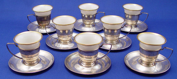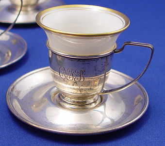 8 LENOX and STERLING DEMITASSE CUPS: Alvin sterling saucers and cups with Lenox fine china inserts. The sterling is monogrammed.