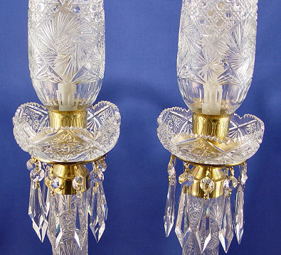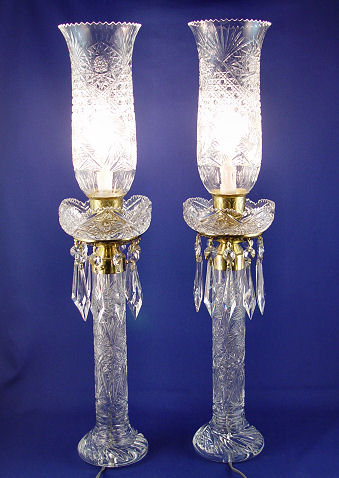 ELEGANT PAIR OF CUT GLASS HURRICANE LAMPS: Cut shade and base, faceted prisms, 25''h, 20th C.