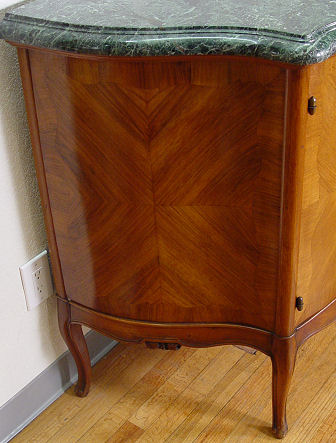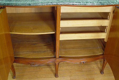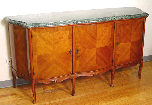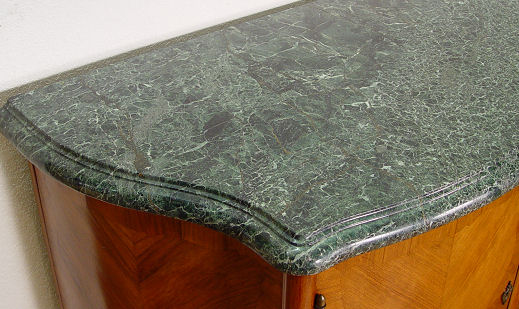 FRENCH MARBLE TOP SIDEBOARD CA. 1920'S: Richly grained green marble top, 1 5/8'' thick, on three door mahogany marquetry cabinet, center compartment has 3 slide out drawers. 39'' h. x 79 1/4'' l. x 22 1/2'' d. Est. $600/800**
