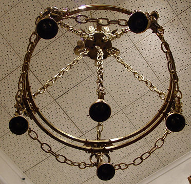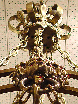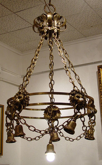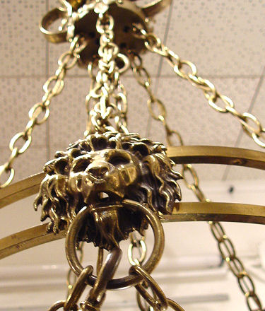 BRASS? LION MASQUERON 6 LIGHT CHANDELIER: Approx. 48''h. x 24''dia. The five side lights are suspended from lion masquerons with rings in their mouths, swags of chain between each and to the top scroll decorated ring. No shades, so you get to pick your own, fitter rim approx. 2 1/2''dia.