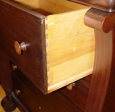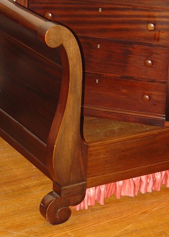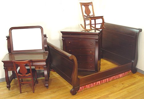 Early 20th C BEDROOM SET WITH SLEIGH BED: Empire style set includes full size bed, tall chest, mirror, vanity with mirror and chair, and a rocking chair.