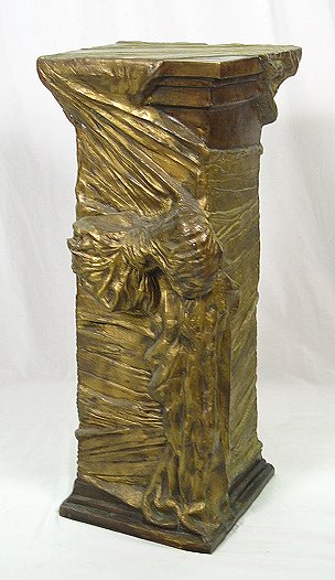 ART NOUVEAU STYLE HEAVY BRONZE PEDESTAL: This is an estate item that appears to have considerable age although the actual age is unknown. Cast so it appears to be wrapped in ribbon and bow. 35''h. 13 1/2'' square surface.