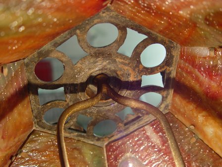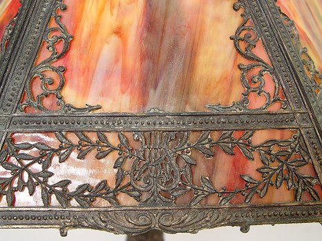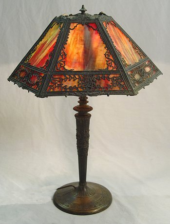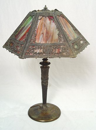 VINTAGE MILLER SLAG GLASS TABLE LAMP: Signed ''ML Co 233'' on the base. 6 panel shade of slag glass under filagree metal. One socket turn switch. 23''h., the shade is 15 1/2'' dia.
