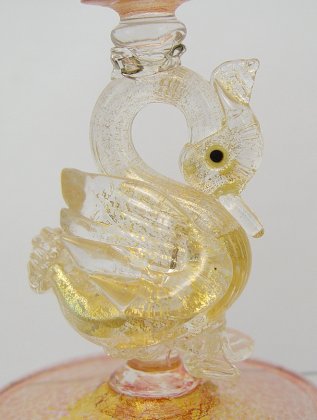 SET OF 6 VENETIAN GLASS SWAN STEMS: Cranberry mottled with gold flecks. The swan figural stems are clear with gold. Please note one swan is lacking half a wing. 5 1/2''h. with no chips or cracks.