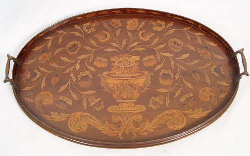 MARQUETRY INLAY TRAY: Featuring all over motif of urn overflowing with flowers. The inlay design follows through to the gallery. 23'' x 15''.
