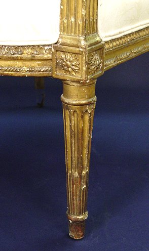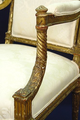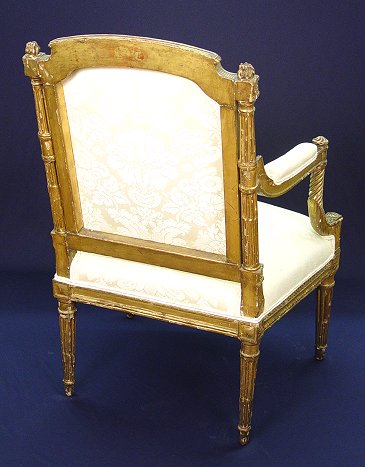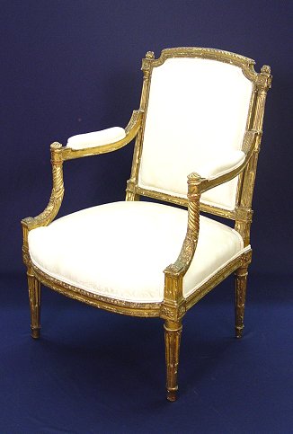 LOUIS XVI CHAIR: Carved gilt gesso wood open arm chair. 37 1/2''h. x 25''w.
