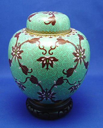 CLOISONNE GINGER JAR COVERED WITH ORCHIDS: Pale green ground with brown, white and darker green flowers and trim work, 8''h, plus wooden stand.