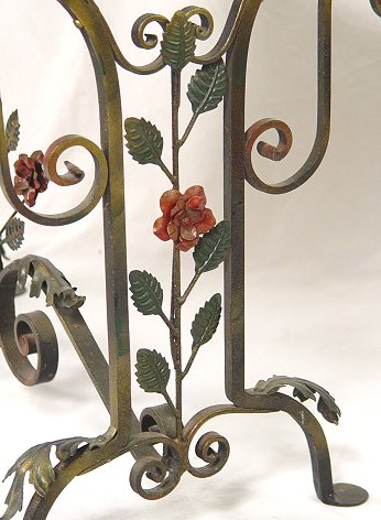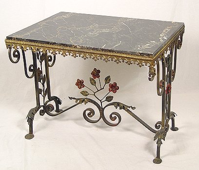 1920's MARBLE TOP WROUGHT IRON SIDE TABLE: Lacquered black marble rests on a base of iron with gilt and polychrome metal. Pierced gallery. 21''h. x 26'' x20''.