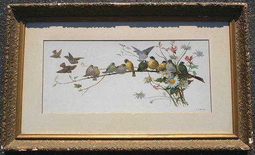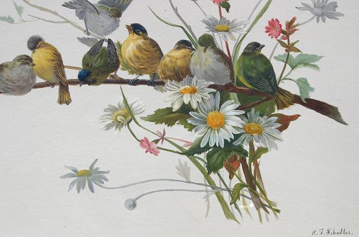 SCHULLER, R.F., (European, 19th C): A Vignette of song birds on a branch with daisies, O/B, sight size 10'' x 22 1/2'', encased in a very worn 19th century gilded gesso molding with overpaint and missing gesso, measures 20'' x 32 1/2''.