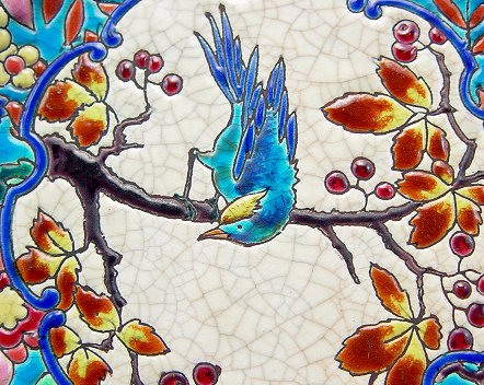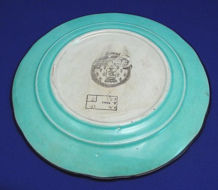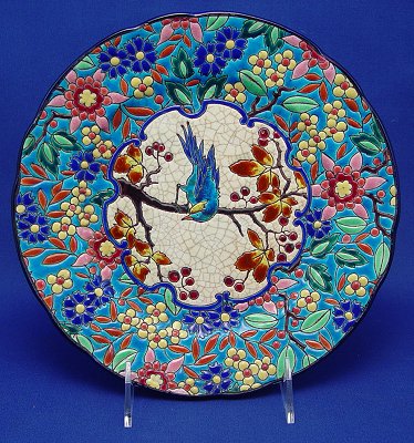 LONGWY FRENCH ENAMEL PLATE: Centering image of a bird on branch. 10 crosses of Lorraine mark. 9'' dia. Free of chips or cracks.