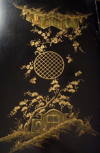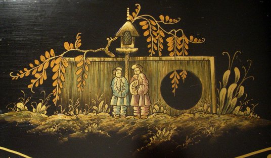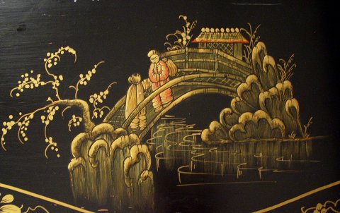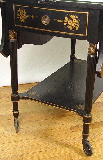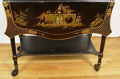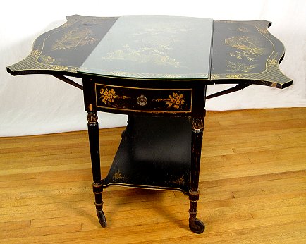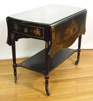 CHINOISERIE DROP LEAF TEA TROLLEY: Shaped leaves, a drawer at each end, reeded legs, double tier. Some wear to the black paint, protective glass top. 20'' x 36'' with leaves, 44'' x 36'' with leaves extended. 30''h.