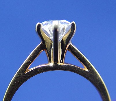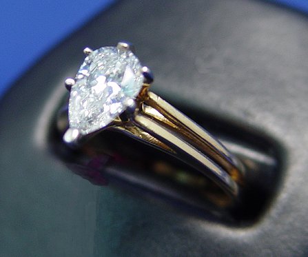 1.01CT PEAR CUT DIAMOND SOLITAIRE: Pear cut diamond, estimated color and clarity H SI, 8.4 x 5.4 x 3.7mm, set in a 14k yellow gold mount with double band appearance to shoulders. Size 6, 2.9 grams. Est. $1600/1800**