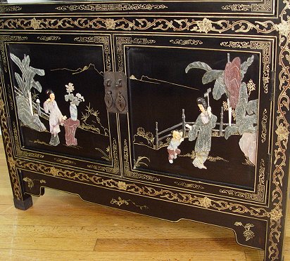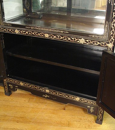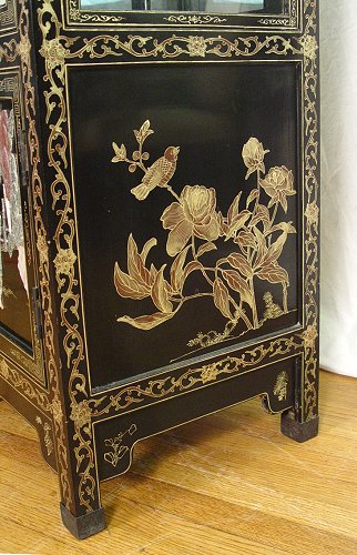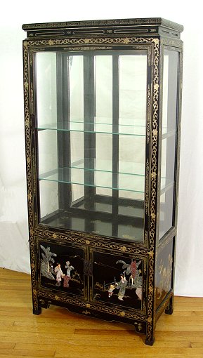 CHINESE BLACK LACQUER CURIO CABINET: Illuminated glass shelf interior, gold painted decoration to the exterior. Glass sides, single glass door, covered storage at the base. 70''h. x 32'' x 16''.