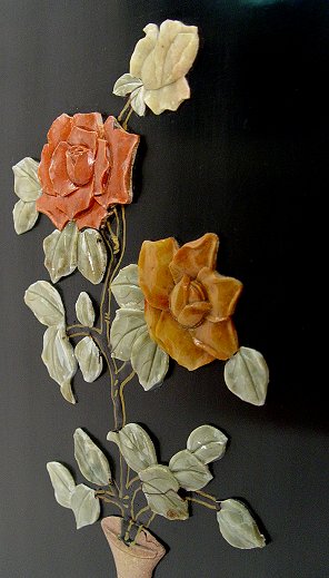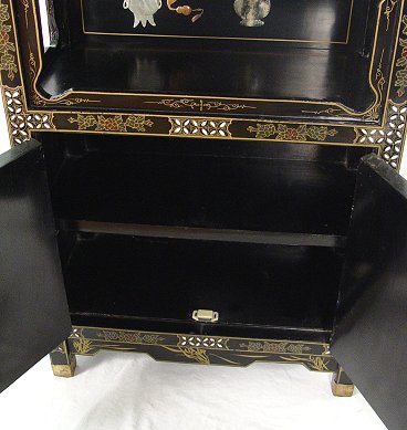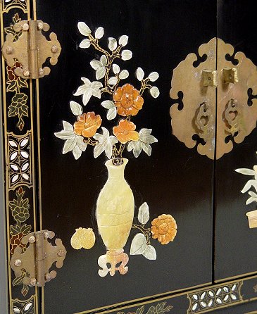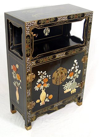 DECORATIVE 20TH C CHINESE CABINET : Decorated in mother of pearl inlay and applied stone. 37''h. x 25'' x12''.