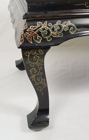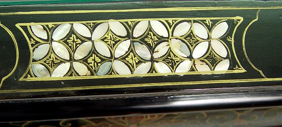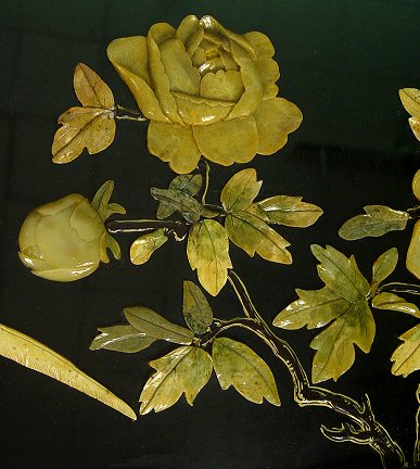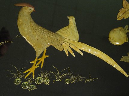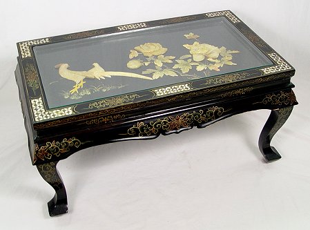 DECORATIVE 20TH C CHINESE COFFEE TABLE: Mother of pearl inlay with a recessed panel decorated with carved stone figures, glass top. 18''h. x 36'' x 20''.