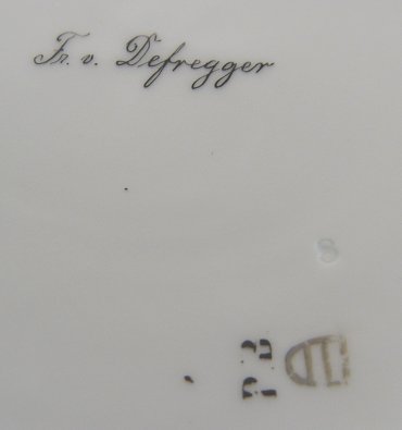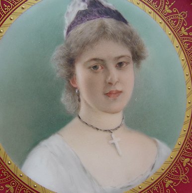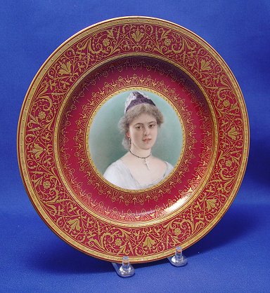 ROYAL VIENNA PORTRAIT PLATE signed DEFREGGER: Intricate gold ornamental rim centers a portrait of a woman proudly wearing a cross at her neck. The back is signed Fr Defregger and bears the gray bee hive mark. 8 1/2'' dia.