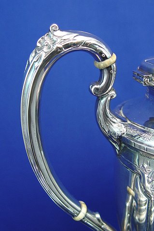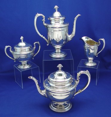 LOUIS XVI STERLING TEA SERVICE BY TOWLE: 4 piece set to include coffee pot, tea pot, covered sugar and cream pitcher. The coffee pot is 10 1/2''h. It has a very unnoticeable dent approx, 1/2''l. The set is approx. 67.84 oz. No monogram.