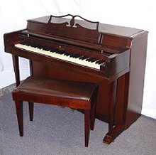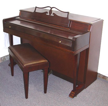 DIMINUTIVE WURLITZER SPINET PIANO: Mahogany cabinet, 73 keys, in good working order. Serial number 554550. Sold with the bench.
