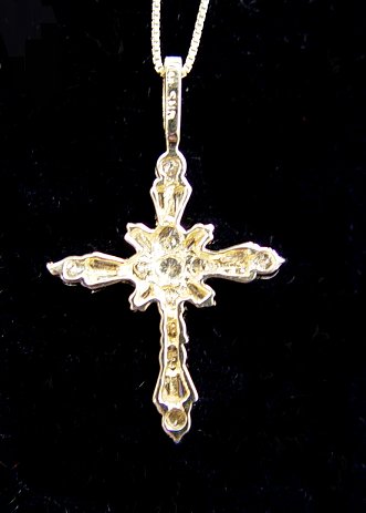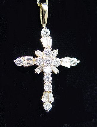 1.5CTW DIAMOND CROSS PENDANT: Consisting of round and tapered baguette diamonds, estimated color and clarity G VS, set in 14k yellow gold pendant, approx. 1 1/2''l, strung on 18'' chain of 14k yellow gold. Est. $500/600**