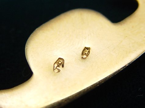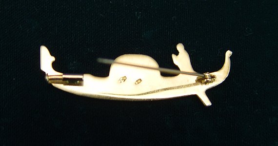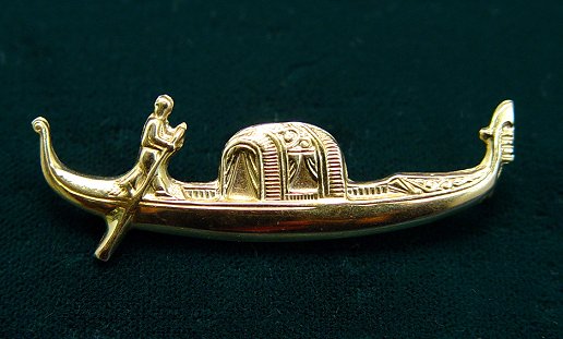 DELIGHTFUL 18K GOLD PIN IN THE SHAPE OF A GONDOLA: Detailed piece complete with gondolier and felze (covered cabin), illegible makers mark verso, 1 3/4''l., 3 grams.