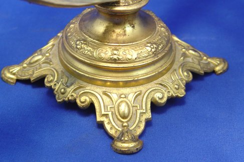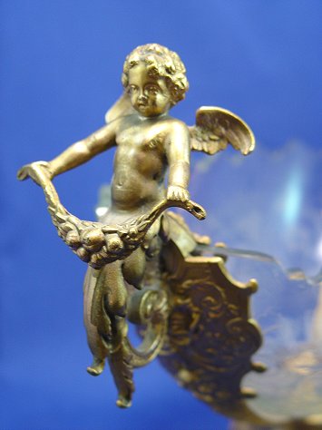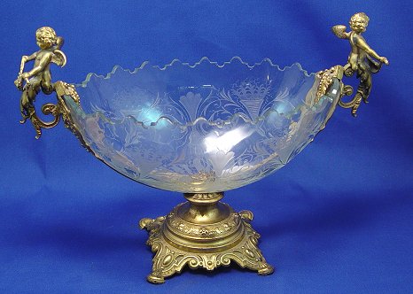 INTAGLIO CUT CRYSTAL CENTER BOWL: Cherub figural bronze mounting and pedestal. The crystal has a fine scalloped edge. 10 1/2''h, 15 1/4''w. overall.