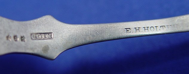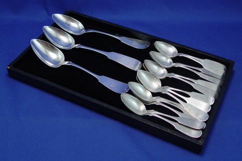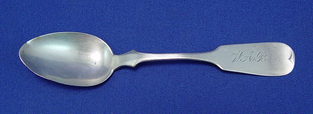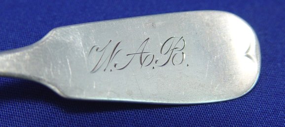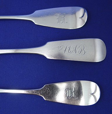 HOTCHKISS & SCHREUDER SPOONS, 1864: To include, 3 serving spoons (2 monogrammed B, 1 WAB) and 6 teaspoons (monogrammed WAB), 6.7oz total. Sold with 8 coin silver teaspoons marked E.H. Holter, monogrammed WAB, 4.76oz.