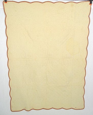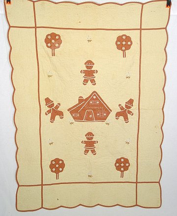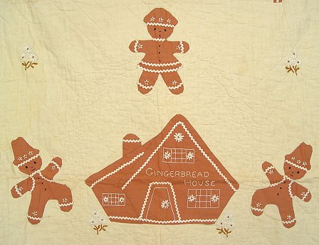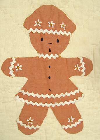 VINTAGE HAND SEWN GINGERBREAD MAN CRIB QUILT: Applique and hand quilting, scalloped edges, 53'' x 39''.