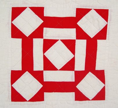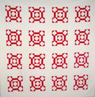 RED & WHITE HAND SEWN QUILT: Circle quilted pattern. 69'' x 70''.