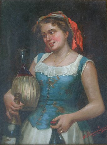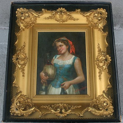 BUONGIORNO, Donatus, (Italian, 1865-?): Young peasant girl with wine vessels, O/C, 12'' x 9'', signed lower right, encased in a gilded gesso frame within a shadow box frame.