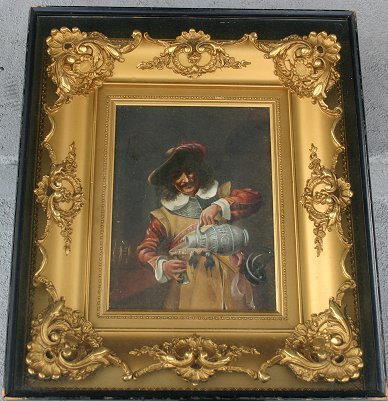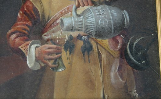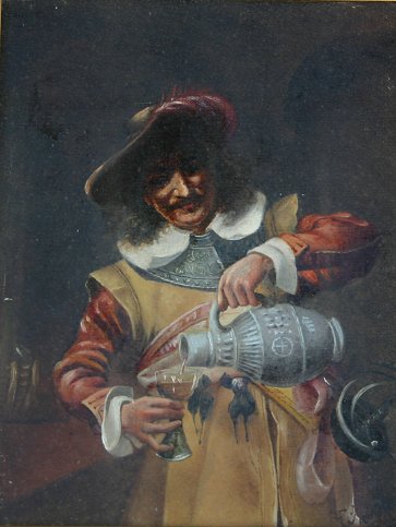 LATE 19TH CENTURY ITALIAN CAVALIER POURING WINE FROM A VESSEL INTO A GOBLET, O/C: 12'' X 9'', signed lower right F. Tabari?, encased in shadow box style frame, overall measurements, 21'' x 18''.